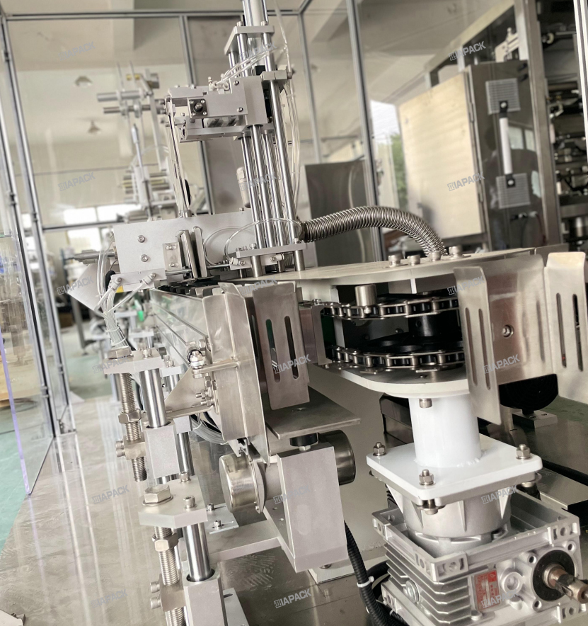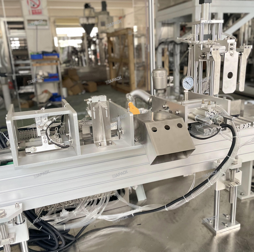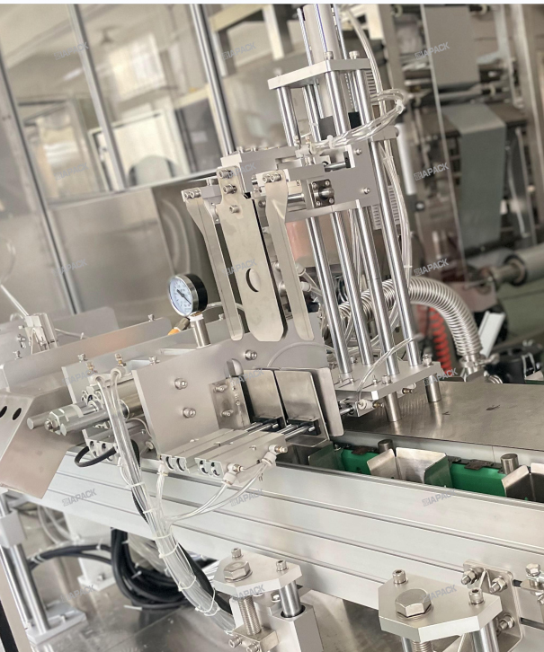Diese Maschine ist speziell für die Herstellung von Seitenfaltenbeuteln mit Etikettierung an der Oberseite konzipiert. Nachdem der volle Beutel mit dem Produkt auf diese Maschine fallen gelassen wurde, transportiert diese Maschine den Beutel, durchläuft einmal eine Beutelfaltung und klebt dann das Etikett auf. Der Maschinenrahmen wird von hergestellt SUS304. SPS und Touchscreen werden von der Marke Siemens übernommen. Und pneumatische Teile übernehmen die Marke SMC. Die wichtigsten elektrischen Komponenten übernehmen die Marken Omron und Schneider. Diese Maschine arbeitet mit einer automatischen Verpackungsmaschine, um die Etikettierung der fertigen Beuteloberseite zu erreichen. Diese Maschine kann die Funktion automatisch erreichen des Etiketts getrennt, Etikett senden. Etikettendetektor und Etikettenpressen.