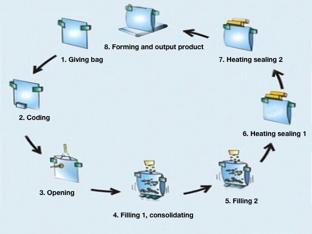 Geschwindigkeit 10-35 Beutel/min(Die Geschwindigkeit hängt vom Produktstatus und Füllgewicht ab)) Gewicht 1400 kg 1520 kg 1580 kg 1650 kg Stromspannung 380V 3phasig 50HZ/60HZ Totale Kraft 2KW 2.2kw 2.5kw 2.5kw Luft komprimieren 0,8 m3/min(vom Benutzer bereitzustellen) 8bar Produktprozess