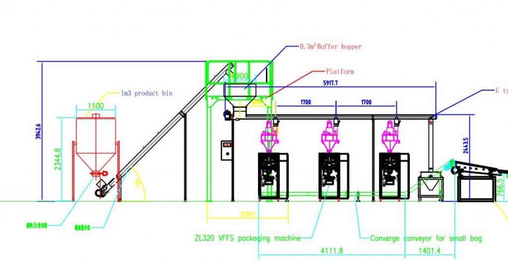 1, Samll-Beutel, der Füllverpackungsmaschine bildet. Dieser Teil umfasst den Rohstofftrichter, die Neigungsschnecken-Zuführmaschine. Mittlerer Puffertrichter und horizontale Zuführschnecke, um den gesamten Rohstoff an 6 Sätze Schneckenmessmaschine zu senden
