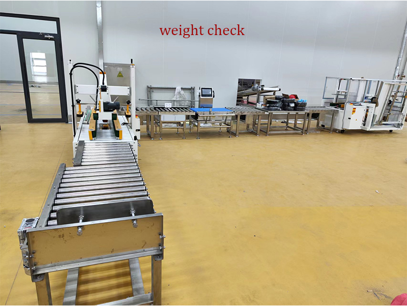 Nach dem Befüllen der Beutel mit Tiefkühlkost wird jeder Beutel erneut von einem Gewichtsdetektor überprüft, um sicherzustellen, dass das Gewicht mit dem Zielgewicht übereinstimmt, und durchläuft dann einen Metalldetektor, um sicherzustellen, dass kein Metall in jeden Beutel gemischt wird. Anschließend werden die Beutel zur Kartonfülllinie transportiert.