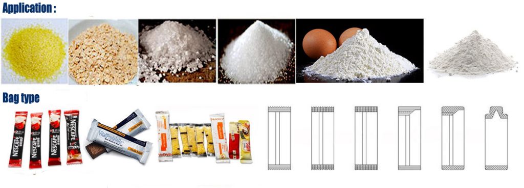 Diese Maschine wird hauptsächlich verwendet, um Puderprodukte zu verpacken: wie Milchpulver, Milchteepulver, Kaffeepulver, Gewürze, Currypulver, Proteinpulver, Würze, Kräuterpulver, chemische und medizinische Puderprodukte.