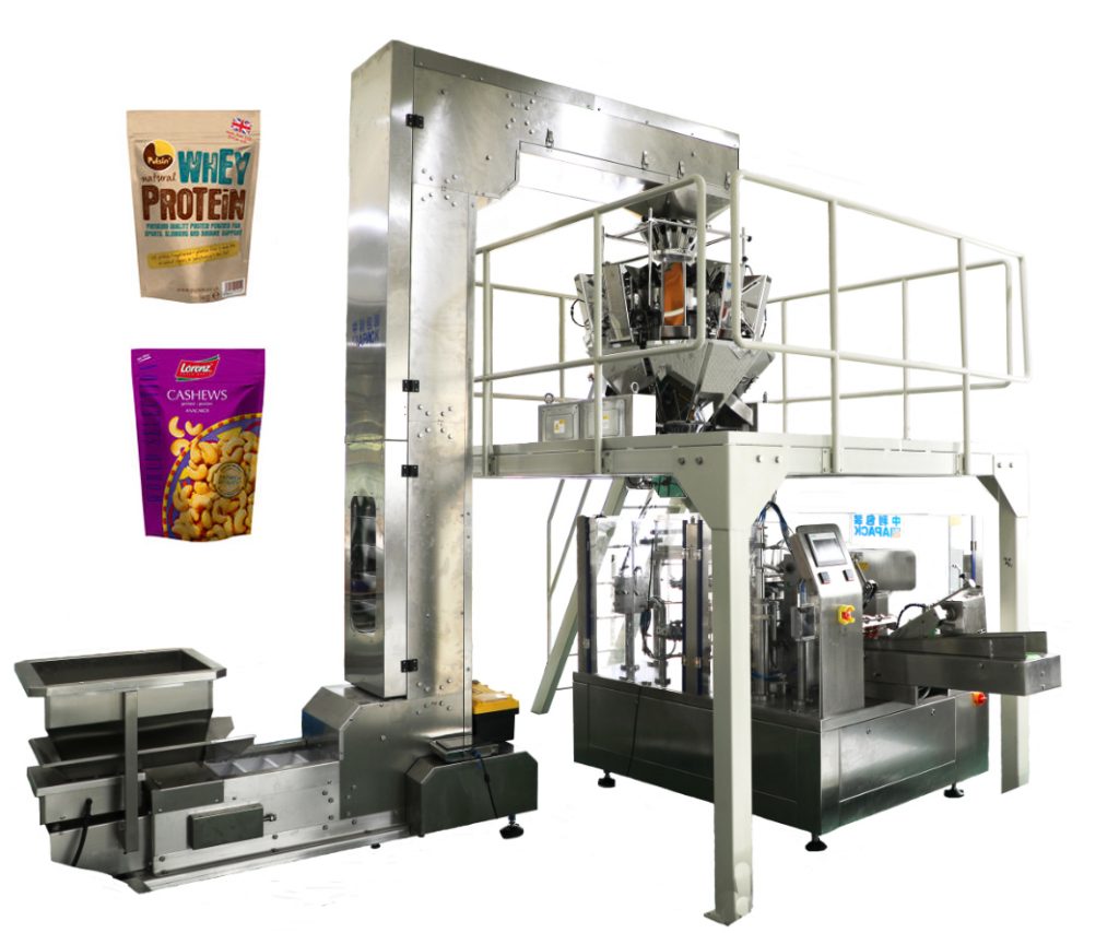 Rotationsbeutelverpackungsmaschine mit unterschiedlicher Dosierung (wie Mehrkopfwaage, Schneckenfüller, flüssiger Füllstoff usw.) kann für das automatische Verpacken von Granulat, Pulver, Flüssigkeit, Paste usw. geeignet sein.