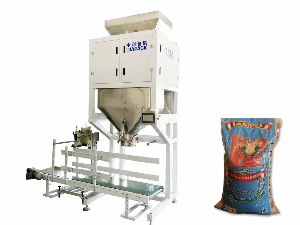 Diese Maschineneinheit umfasst eine Doppeleimer-Wägemaschine zum Messen von 30-50 kg Beutelnähen und Heißsiegeln. Der Beutel muss nur manuell zugeführt werden.